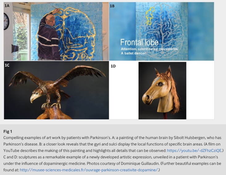 “The recognition that art can serve as treatment for patients is growing. Dance and music can help patients with Parkinson’s to overcome their characteristic loss of automated movements. We’ve seen compelling examples of patients using artistic expression—paintings, drawings, books, poetry, music—to provide positive connotations to their disease (fig 1). These include the creativity unleashed by dopaminergic medicine which, if not excessive, can improve the patient’s wellbeing, allowing physicians to exploit this as part of their therapeutic repertoire.”