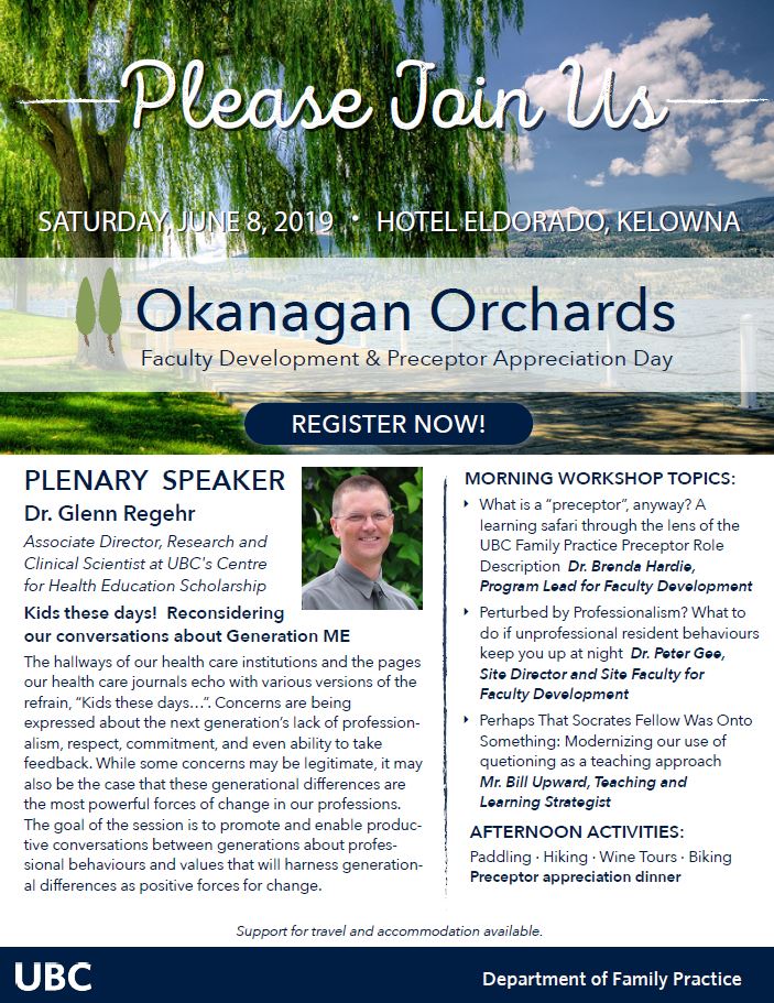 A $250 travel reimbursement will be available to eligible preceptors from out-of-town. There are a limited number of guest rooms held at Hotel Eldorado in Kelowna, so booking early is recommended. Please call the hotel directly at 1-866-608-7500 and quote UBC Family Practice.