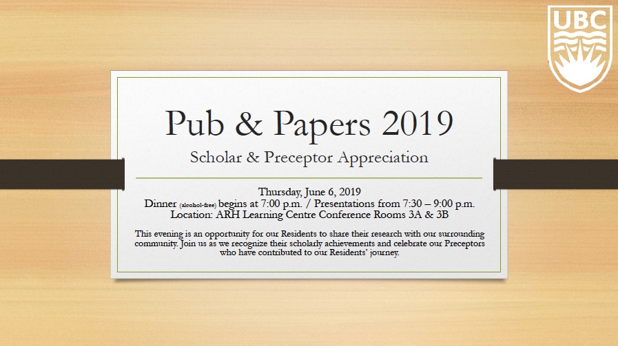 Join our UBC Abbotsford-Mission Family Practice Residency Program as we recognize our Residents’ scholarly achievements and celebrate our Preceptors who have contributed to our Residents’ journey! This informal evening is an opportunity for our Residents to share their research with our surrounding community and for our program to continue to network, collaborate, and build upon the ideas and insights emerging from our Residents’ work.