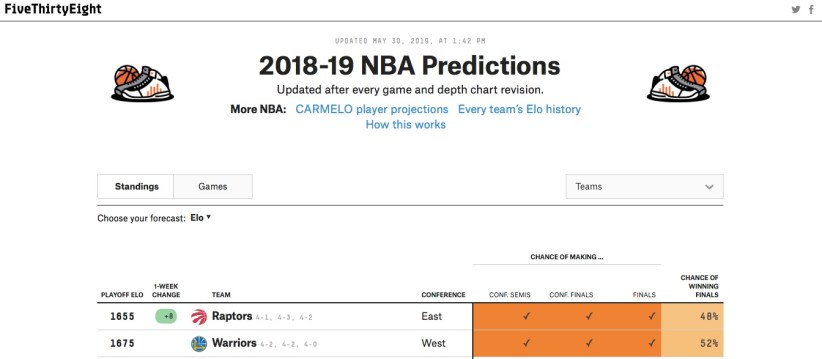 Big game coming up tonight! FiveThirtyEight’s Elo rating system narrowly predicts the #Warriors. What’s heavily influencing the outcome of the series are injuries plaguing some of the top performers and their clearance to play during the finals. Here’s an interesting piece on the topic Well-Come Back! Professional Basketball Players Perceptions of Psychosocial and Behavioral Factors Influencing a Return to Pre-injury Levels (2019) by Conti et al via Front. Psychol.