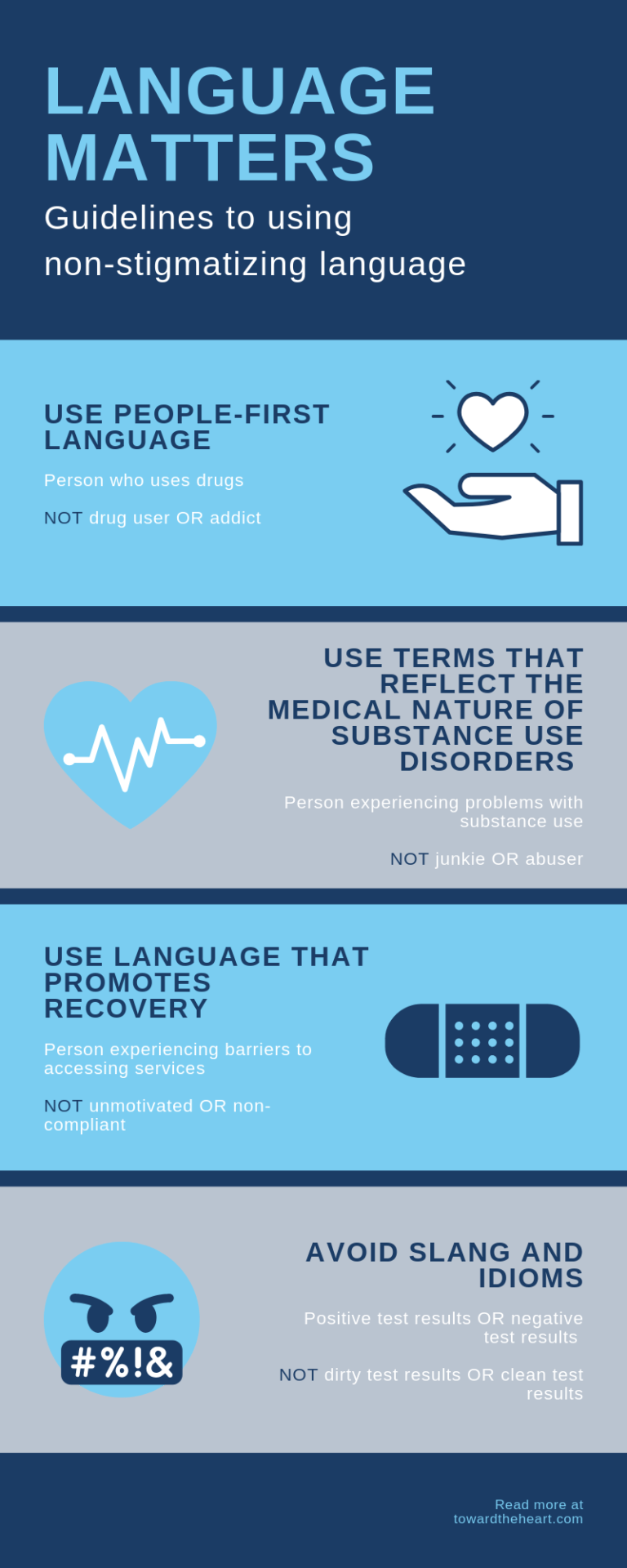 “An important aspect of Buxton’s work is encouraging the use of respectful, non-stigmatizing language when describing substance use disorders, addiction and people who use drugs. Stigmatization has a direct impact on people who use drugs, she said. It contributes to isolation, which means people who use drugs may use alone and will be less likely to access harm-reduction services or treatment such as a supervised injection site or naloxone, a medication that quickly reverses the effects of an overdose.”