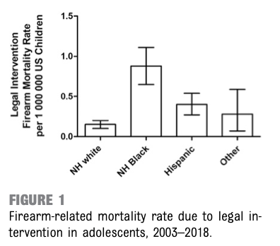 Firearms are the second leading cause of pediatric death in the United States, with noted racial and ethnic disparities. We sought to measure racial and ethnic differences in adolescent mortality rates related to firearm injury from law enforcement over a 16-year period.”