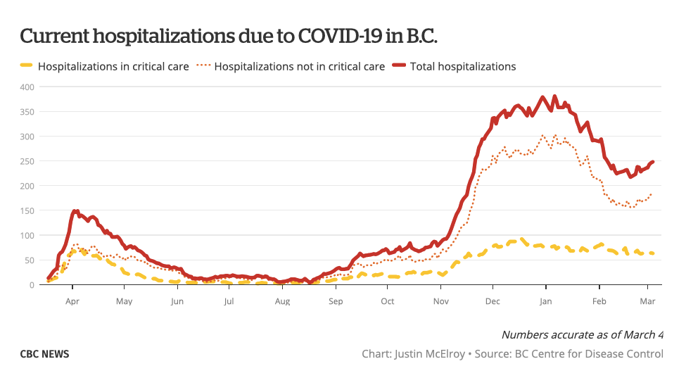 A total of 248 people are in hospital, 63 of whom are in intensive care. There are currently 4,743 active cases of COVID-19 in B.C. and 1,376 people have died of the disease since the pandemic began.