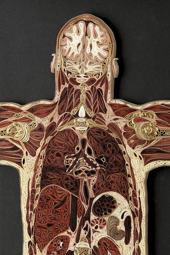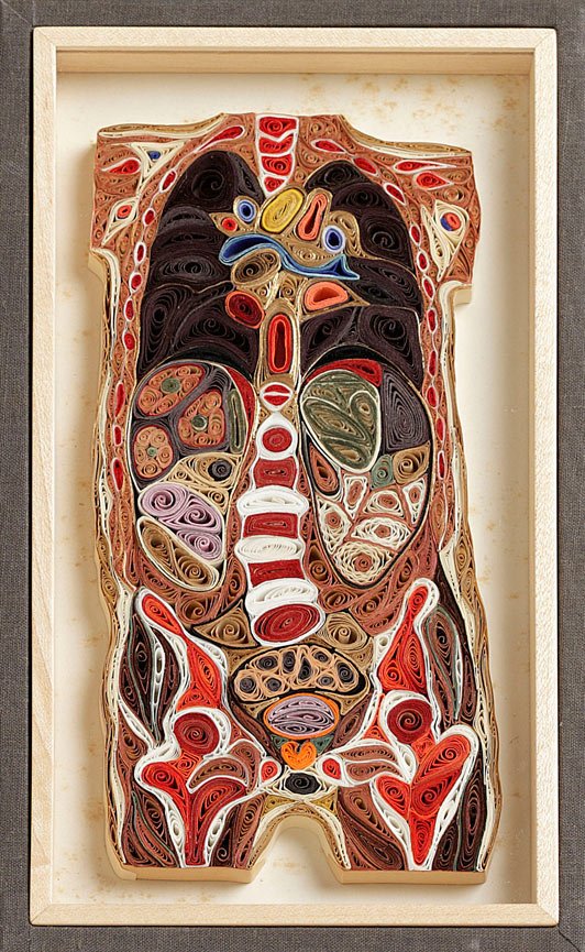 “The pieces that comprise Lisa Nilsson’s ‘Tissue Series’ are made of Japanese mulberry paper and the gilded edges of old books. They are constructed by a technique of rolling and shaping narrow strips of paper called quilling or paper filigree. Quilling was said to have been first practiced by Renaissance nuns and monks who made artistic use of the gilded edges of worn out bibles, and later by 18th century ladies who made artistic use of lots of free time. Lisa finds quilling exquisitely satisfying for rendering the densely squished and lovely internal landscape of the human body in cross-section.”
