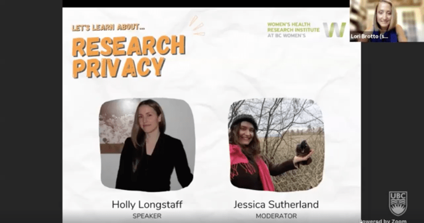 For those residents interested in pursuing research that involves patients, I encourage you to watch WHRI’s public event focused on privacy and security in health research. Dr. Holly Longtaff, Research Privacy Director at the Provincial Health Services Authority, gave a presentation about why participation in research is necessary and public safety. Jessica Sutherland, member of the Patient Research Advisory Board for the Endometriosis and Pelvic Pain Laboratory at UBC, moderated the talk.