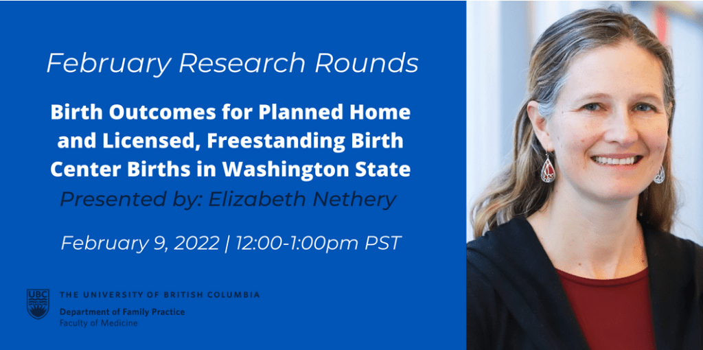 In this presentation on February 9, 2022 at noon PST, Elizabeth Nethery – PhD candidate in the School of Population and Public Health at the University of British Columbia and Registered Midwife in BC – will present research describing rates of maternal and perinatal birth outcomes for community births and to compare outcomes by planned place of birth (home vs state-licensed, freestanding birth center) in a Washington State birth cohort.
