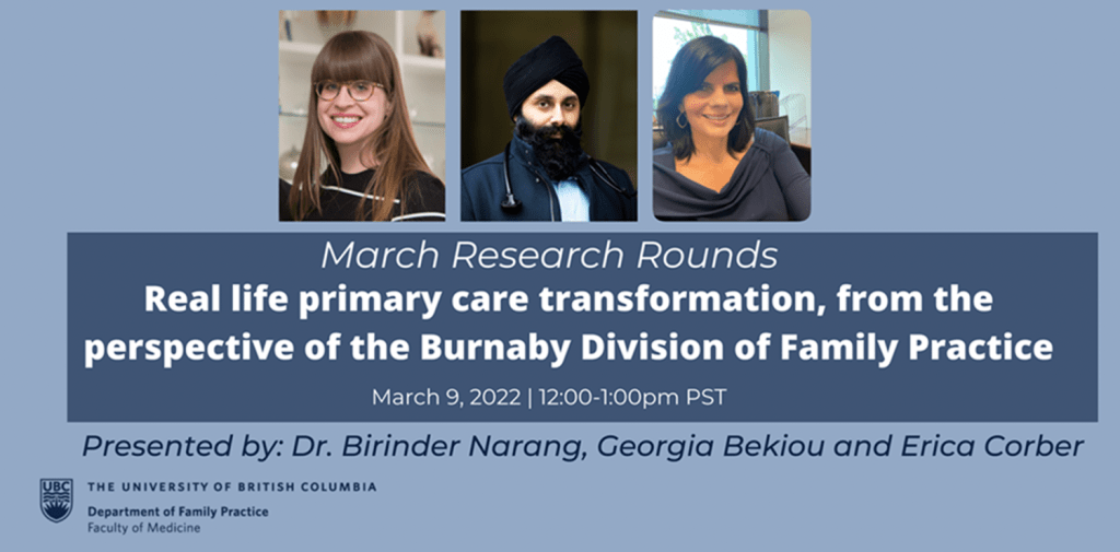In this presentation on March 9, 2022 at noon PST, leadership of the Burnaby Division of Family Practice, Dr Birinder Narang, Georgia Bekiou and Erica Corber, will present the work of the Burnaby PCN over the past 3 years. Through this, the power of collaboration among family physicians, health authority & the community will be highlighted. There will be an honest discussion on success and struggles in the context of the current state of Primary Care in BC.