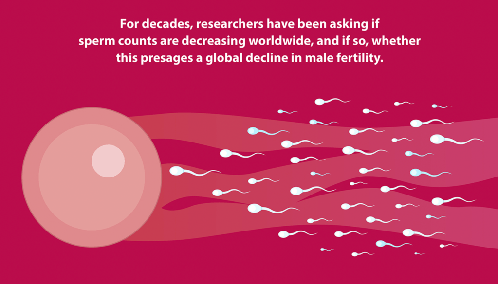 “For decades, researchers have been asking if sperm counts are decreasing worldwide, and if so, whether this presages a global decline in male fertility. Most recently, a large systematic review and meta-regression analysis sought to identify trends in sperm counts between 1981 and 2013 and found that sperm counts appeared to be declining rather than stabilizing. One of the complicating features of relying on sperm count as a marker of fertility is that a low sperm count does not guarantee an inability to conceive. A large variety of factors, including tobacco, alcohol, and drug use; psychological stress; obesity; insufficient sleep; and environmental factors such as air pollutants and heavy metals, have been identified as potential risk factors affecting semen quality. Initial investigations recommended for a patient presenting with fertility concerns include a detailed history, physical examination, investigations based on the clinical context, and semen analysis for most patients. Although the evidence is conflicting, our review suggests that the potential decline in male sperm counts does not necessarily translate to a decline in male fertility.”