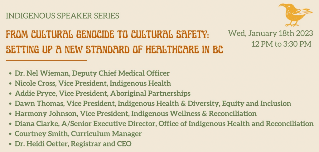 Join us virtually on Wednesday, January 18, 2023 from 12–3:30 pm. This fifth Indigenous Speaker Series session features a panel that brings together BC healthcare organizations and their senior representatives to discuss the work of cultural safety, cultural humility, and the broader work in regards to the recommendations from In Plain Sight, Truth and Reconciliation, and the Declaration on the Rights of Indigenous Peoples Act Action Plan. This important and timely dialogue will highlight the work being undertaken across the province in an effort to reconcile and redress the relationship between Indigenous peoples and health care professionals and systems.
