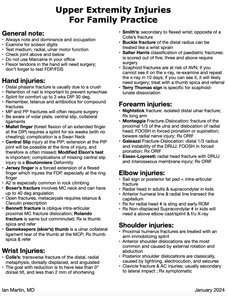 A big thank you to Dr. Ian Martin for his academic half day presentation on “X-Rays: Part I” and for sharing his handout on upper extremity injuries for family practice.