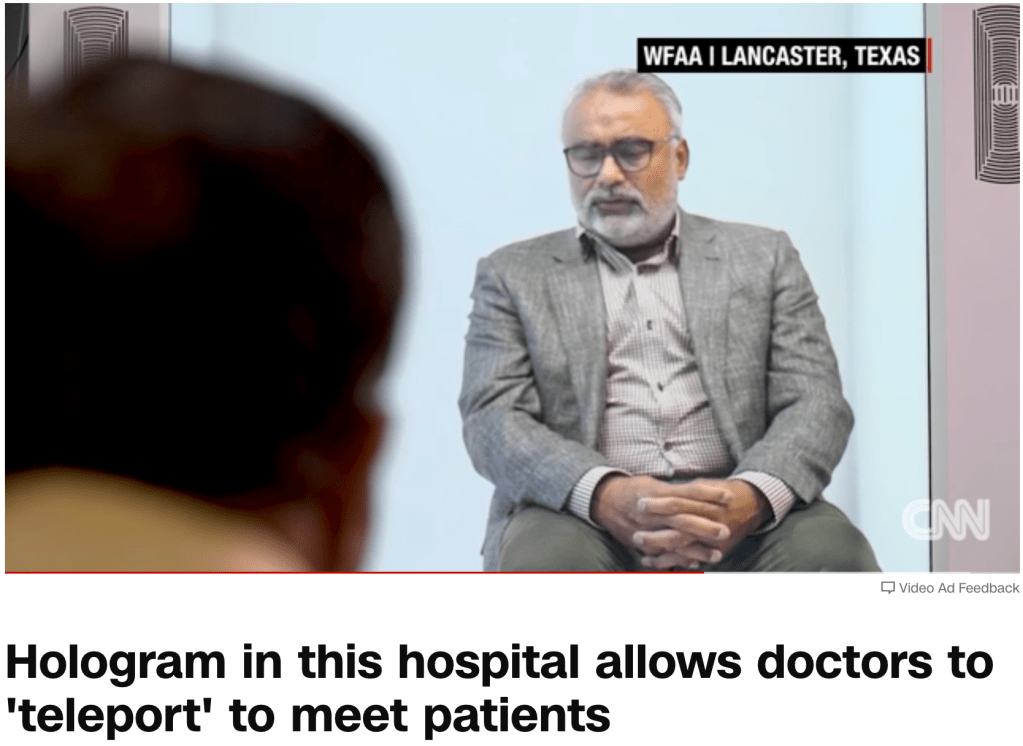 “A newly installed holographic display in Crescent Regional Hospital in Lancaster, Texas, is allowing doctors to meet with patients in real-time and helping them reduce travel time.” CNN affiliate WFAA has more.