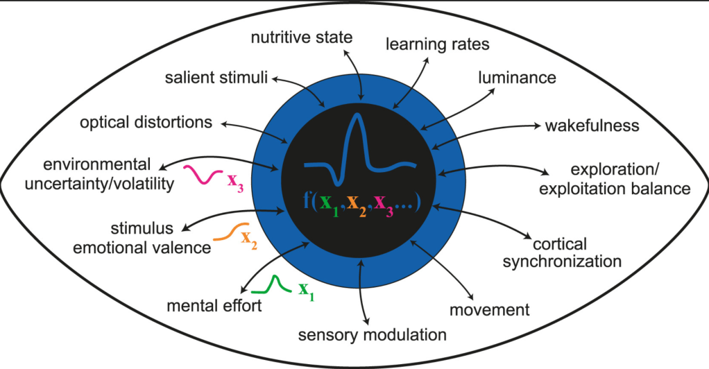 “Pupil size is a widely used metric of brain state. It is one of the few signals originating from the brain that can be readily monitored with low-cost devices in basic science, clinical, and home settings. It is, therefore, important to investigate and generate well-defined theories related to specific interpretations of this metric. What exactly does it tell us about the brain? Pupils constrict in response to light and dilate during darkness, but the brain also controls pupil size irrespective of luminosity. Pupil size fluctuations resulting from ongoing “brain states” are used as a metric of arousal, but what is pupil-linked arousal and how should it be interpreted in neural, cognitive, and computational terms? Here, we discuss some recent findings related to these issues. We identify open questions and propose how to answer them through a combination of well-defined tasks, neurocomputational models, and neurophysiological probing of the interconnected loops of causes and consequences of pupil size.”