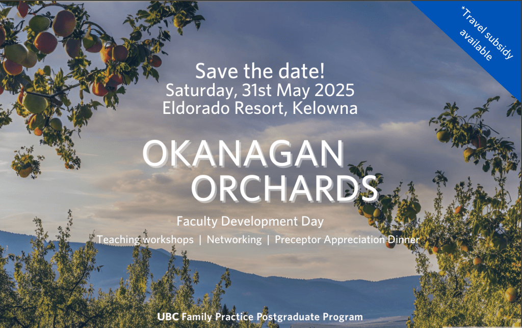 We’re excited to announce that Okanagan Orchards is confirmed for Saturday, May 31st at the Eldorado Resort in Kelowna! This is the annual Family Practice Postgraduate Program’s faculty development and appreciation event.