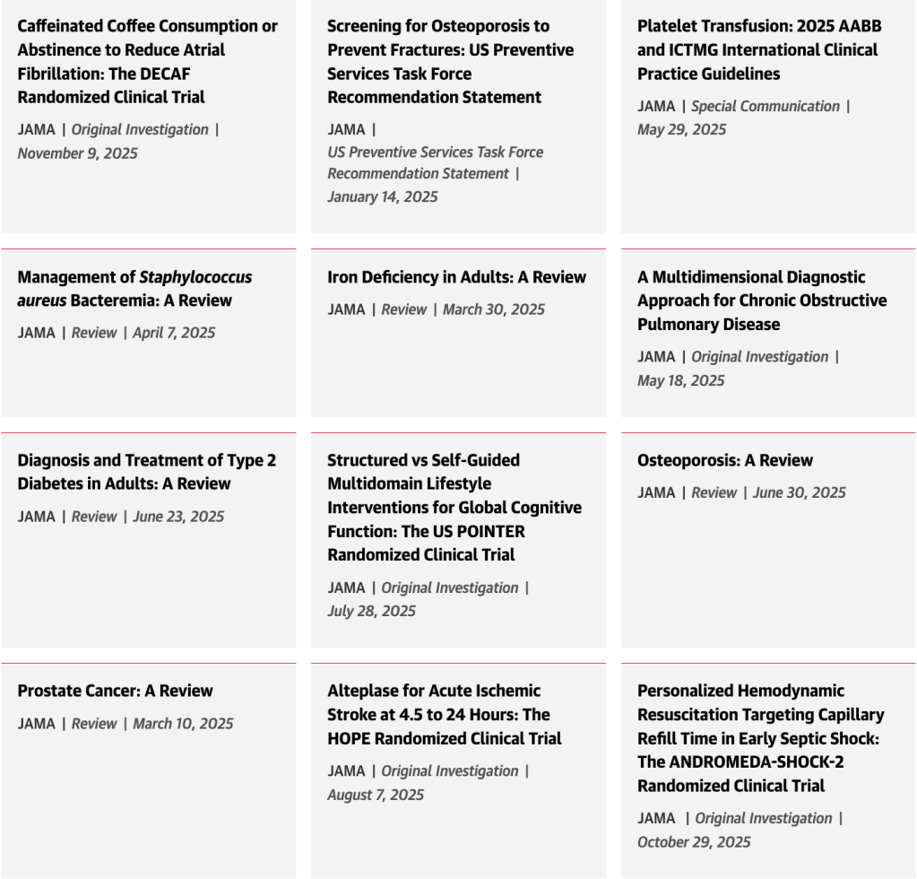 Read the most popular JAMA articles in 2025 including coffee and AFib, osteoporosis, platelet transfusion, type 2 diabetes, S aureus bacteremia, septic shock, and more.