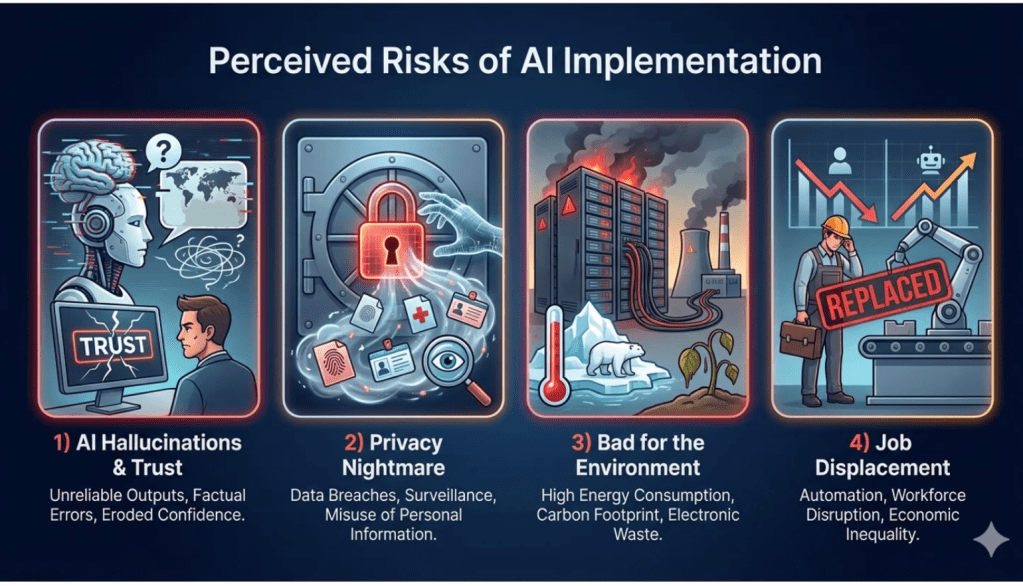 + Implementation risks are real: trust (confabulation, over-reliance), privacy, environmental cost, workforce disruption.