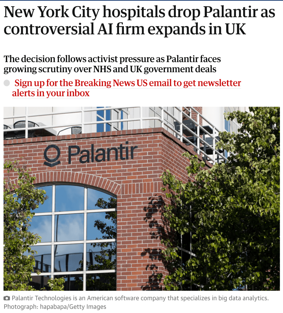 New York City hospitals drop Palantir as controversial AI firm expands in UK via The Guardian.