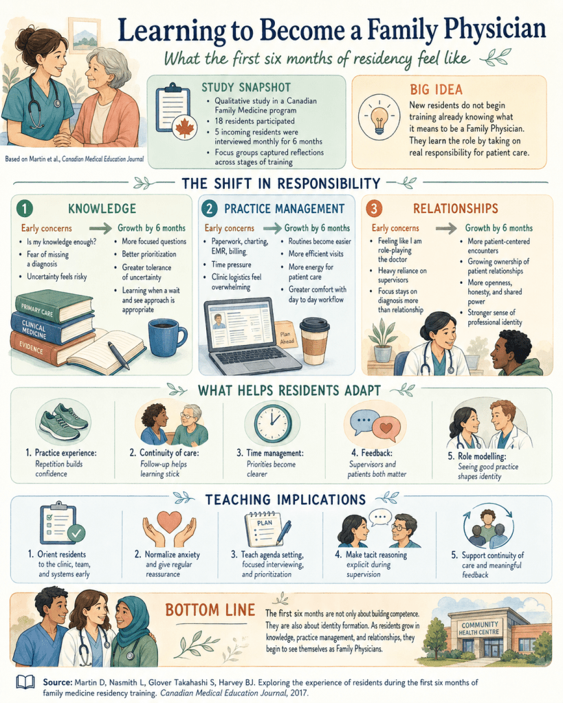What I appreciate most about this work is that it normalizes the anxiety of early residency while also showing how residents grow through continuity of care, feedback, role modelling, and repeated practice. The first six months are not only about building competence. They are about identity formation: learning, slowly and meaningfully, what it feels like to become someone’s doctor.